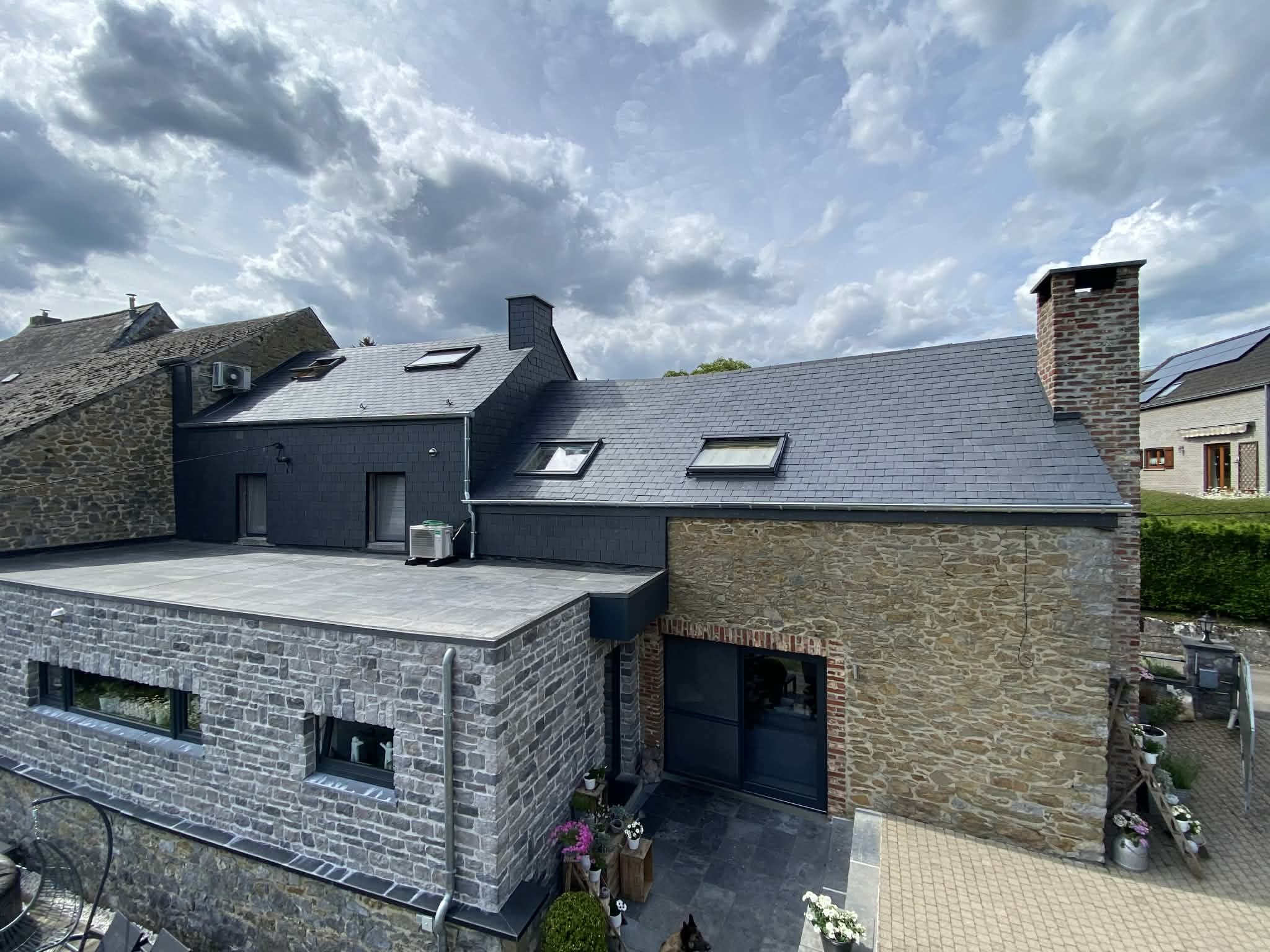 4. Revêtements : Enfin, nous avons appliqué les revêtements extérieurs. Afin de respecter l’esthétique régionale, nous avons opté pour des pierres du pays reconstituées et collées.